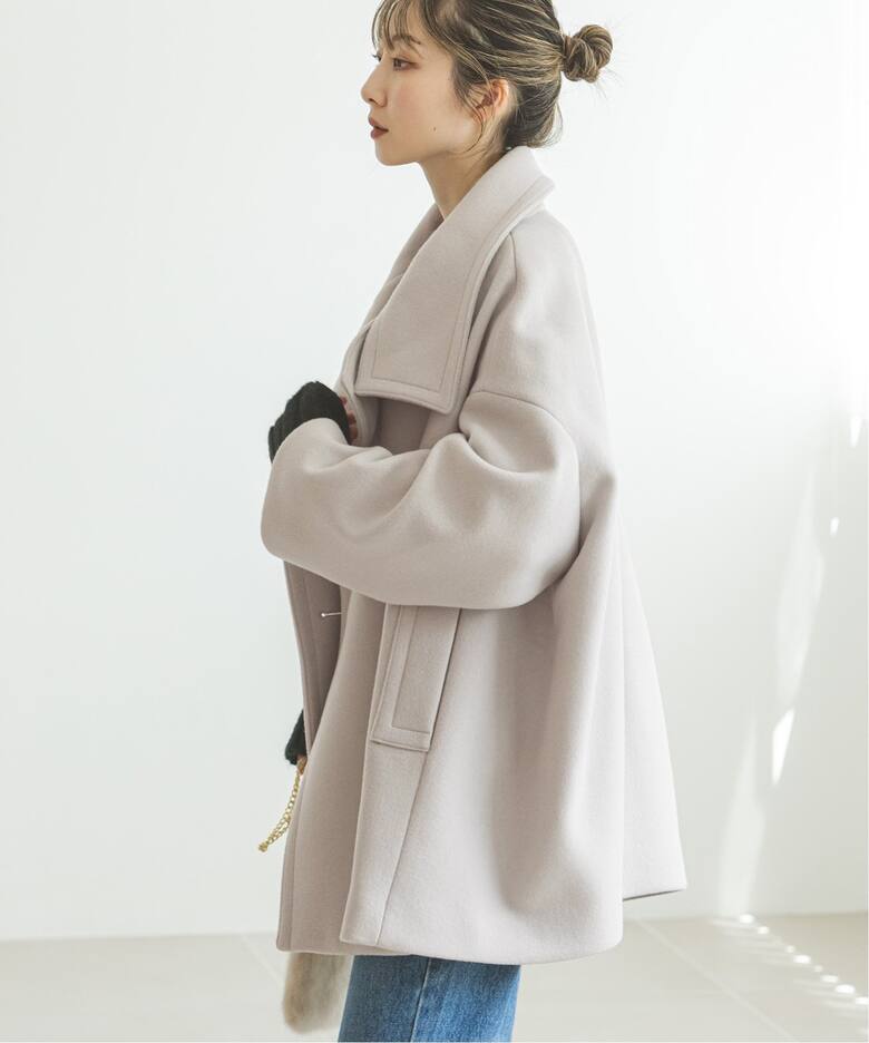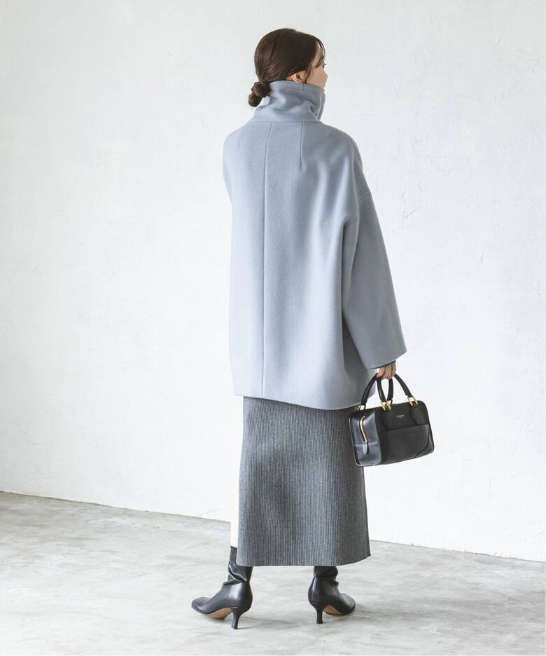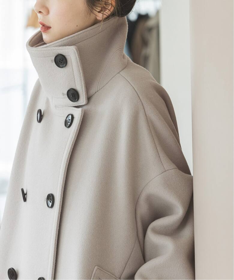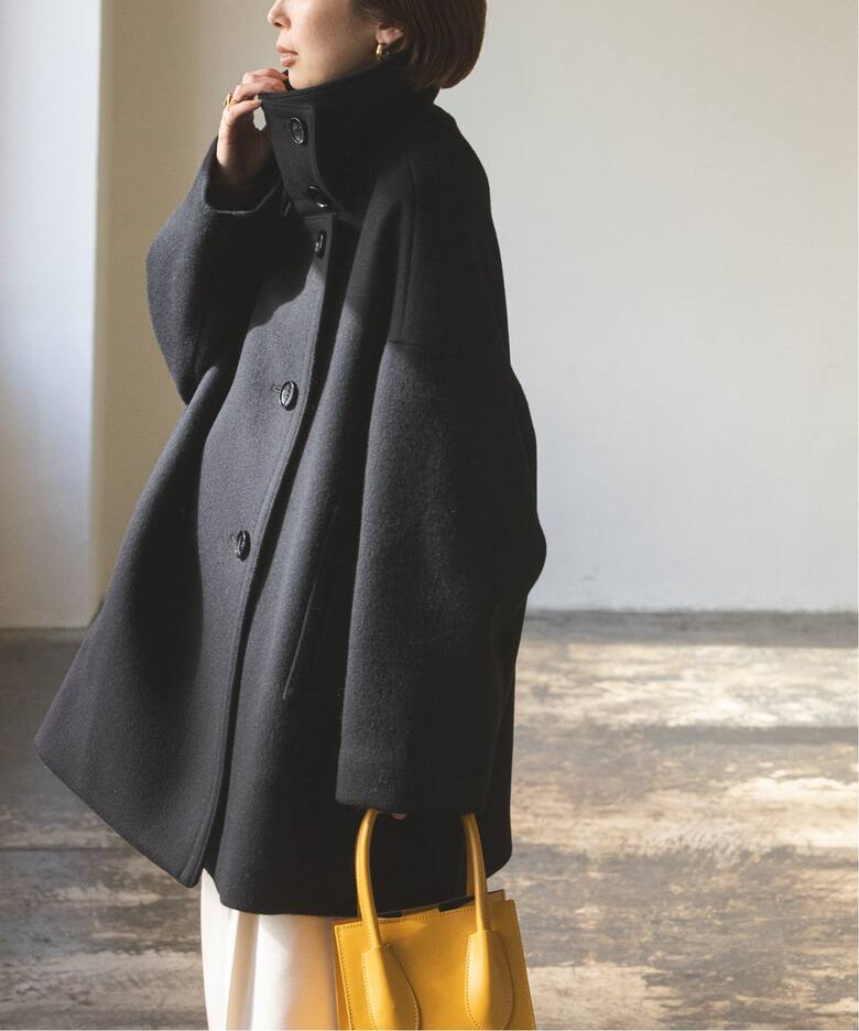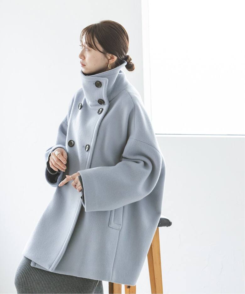 マニッシュな印象に女性らしさを感じられるスタンドカラーコート。