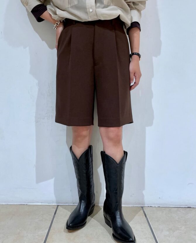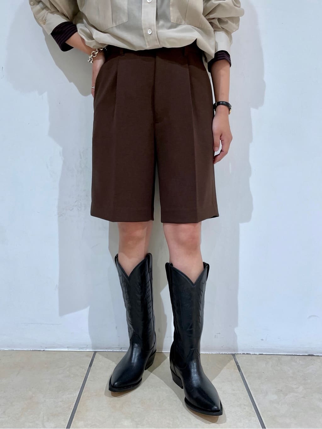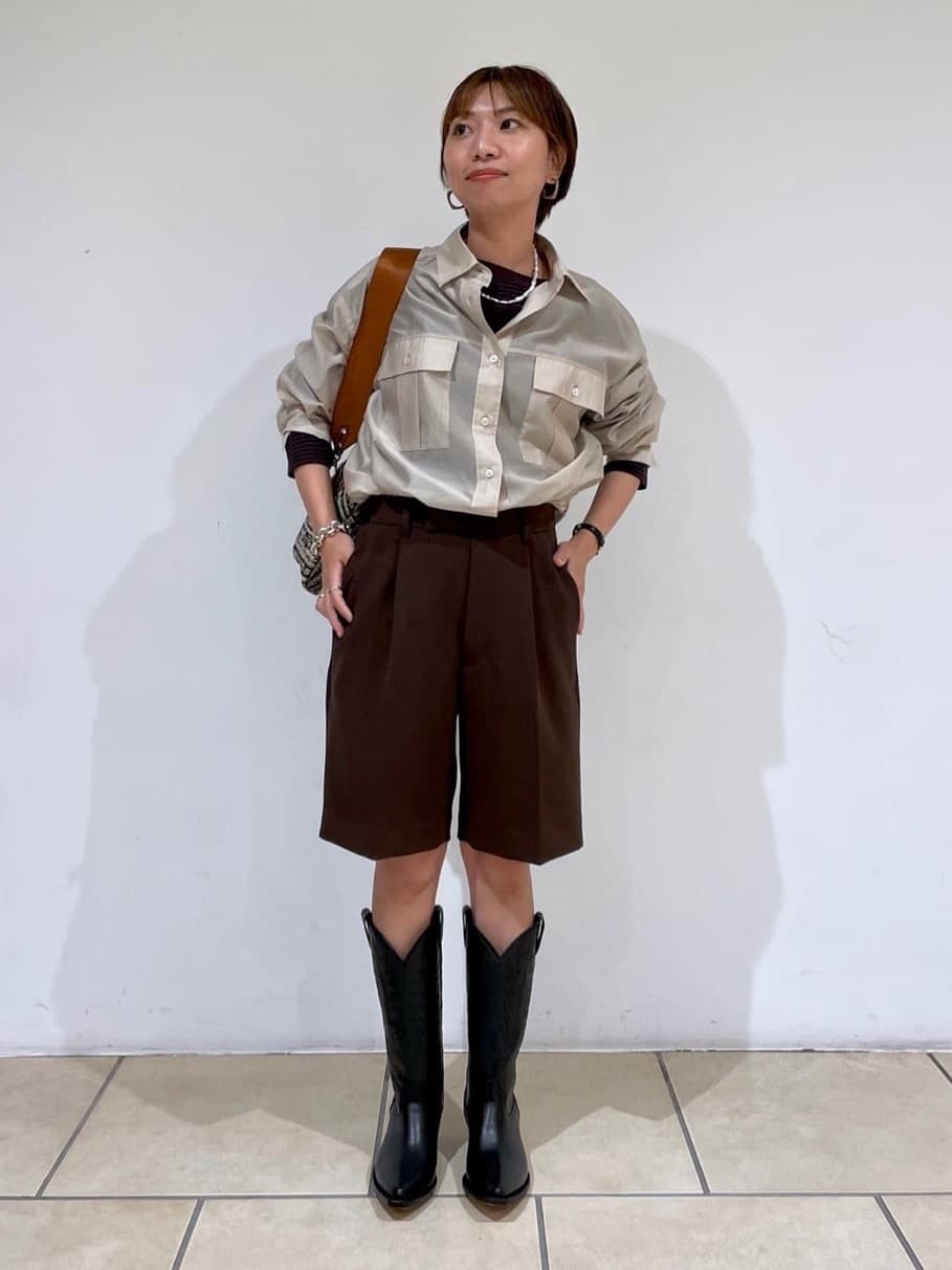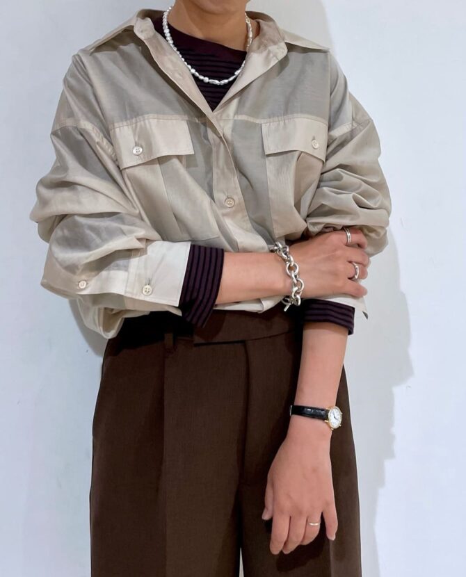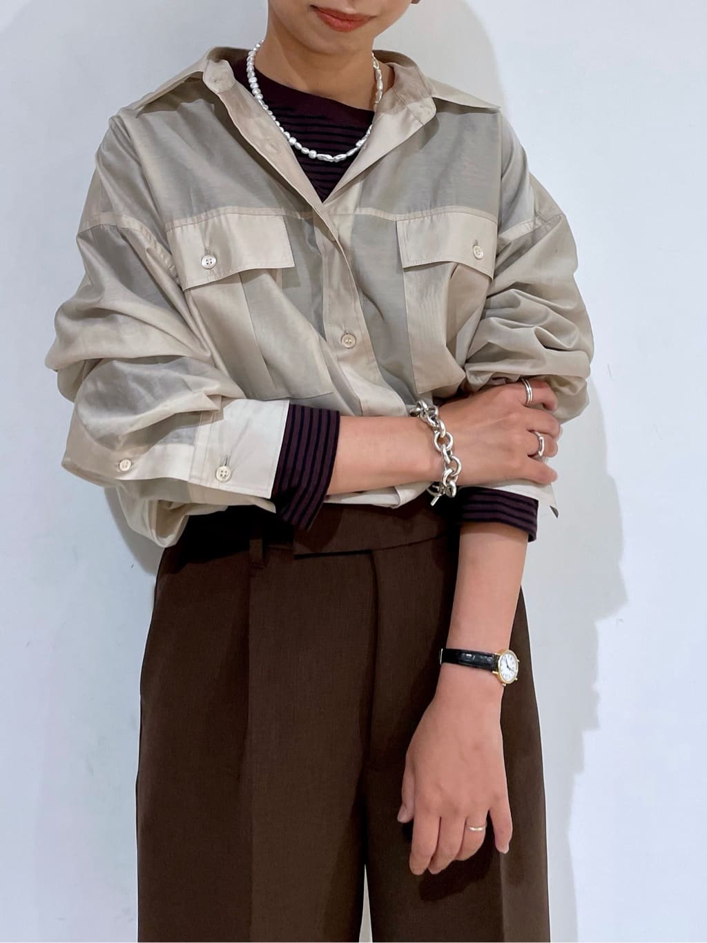 シャツは透け感は程よくゆとりもあるサイズ感です。中に重ね着しやすくこれからの季節もしっかり着回し出来ます。ワントーンにスタイリングをまとめるとシアー素材のお洋服でも色にメリハリがつくので秋らしい雰囲気になります。ロングブーツや小物合わせもポイントです。